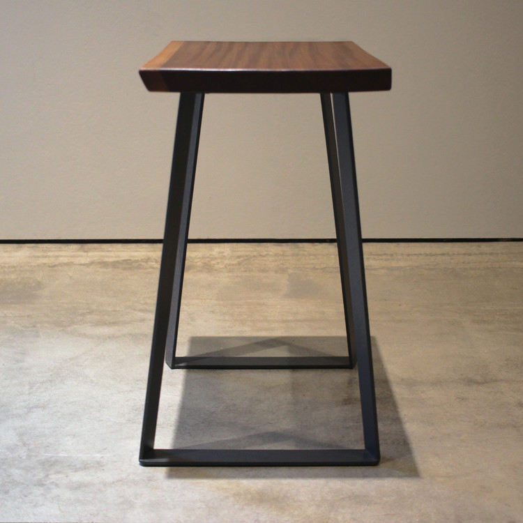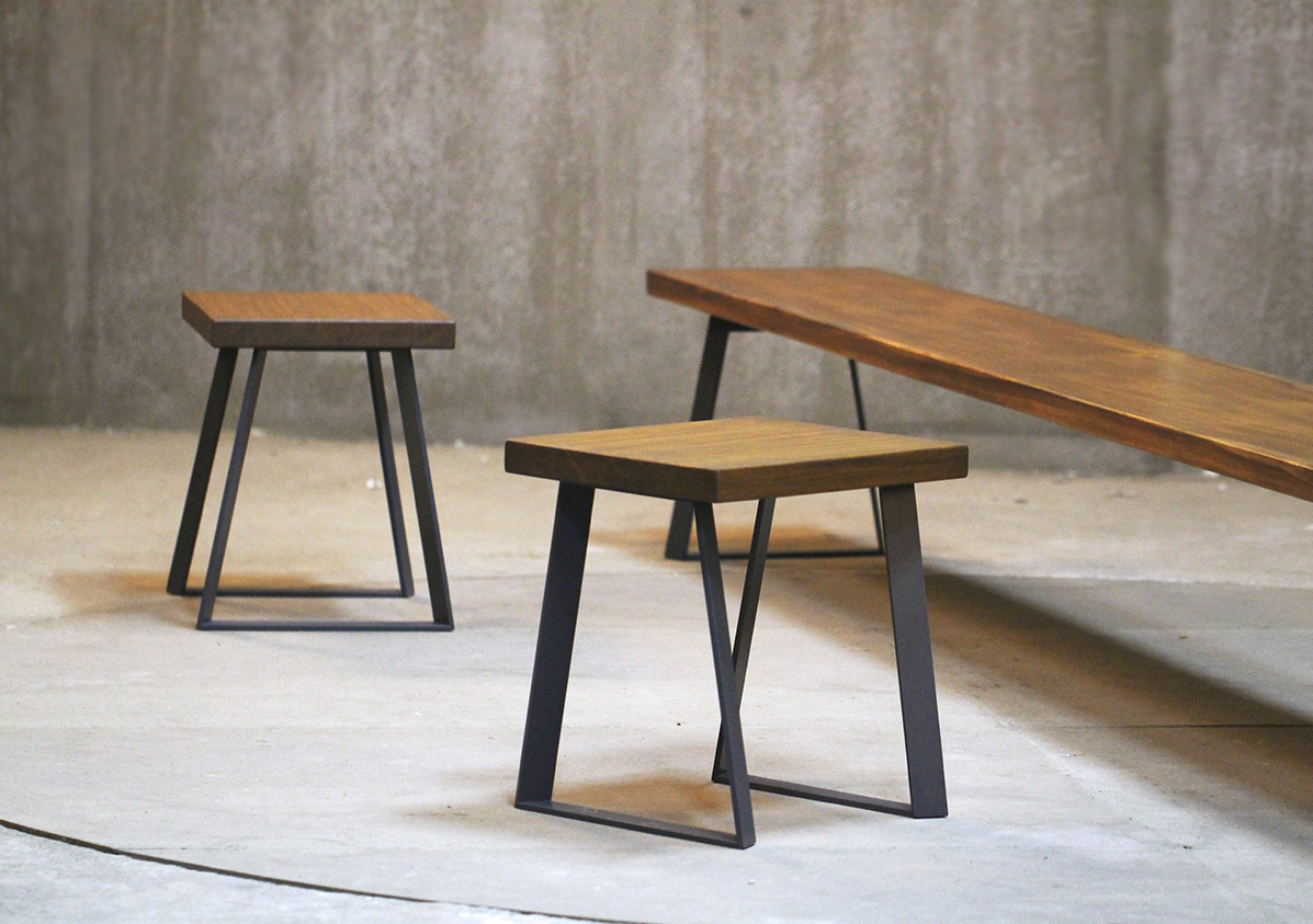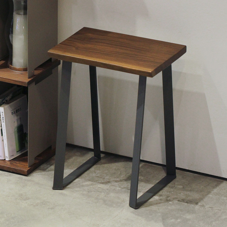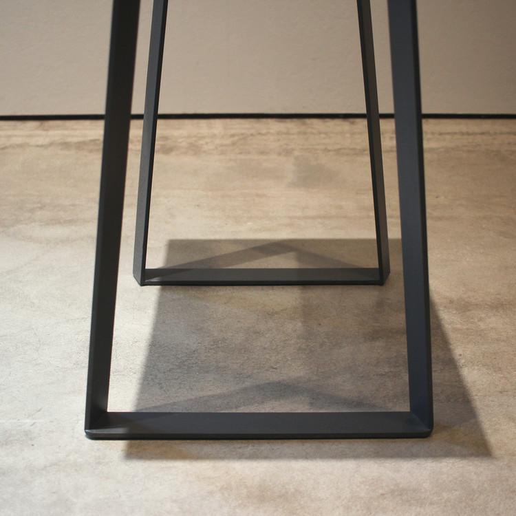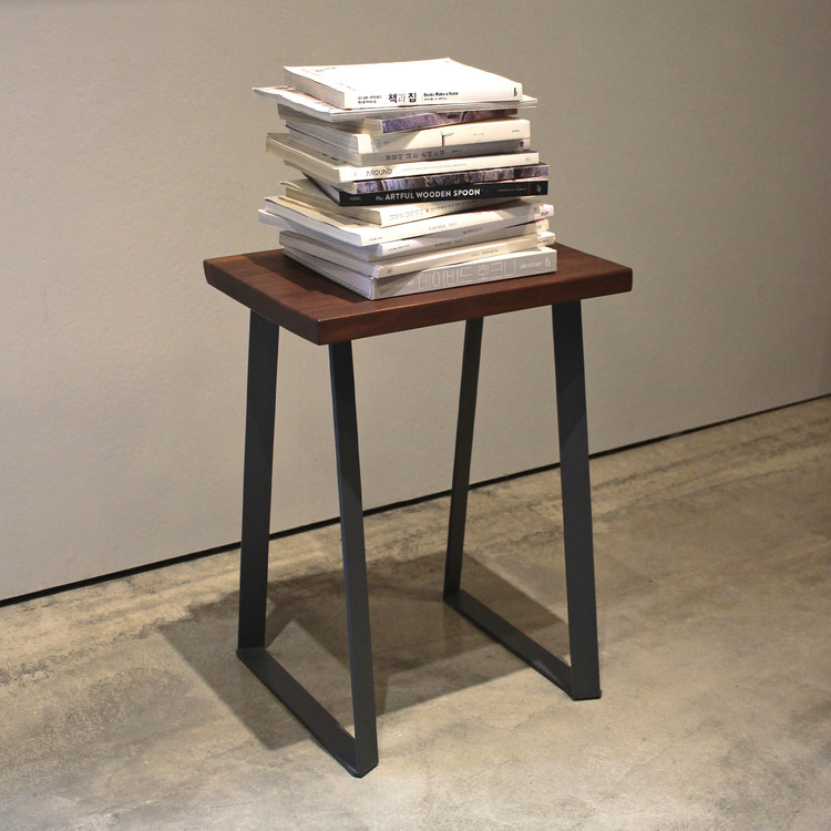 평철을 꺾어 만든 각진 사다리꼴의 철제 다리가 어우러져