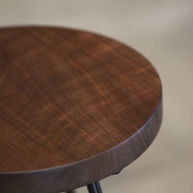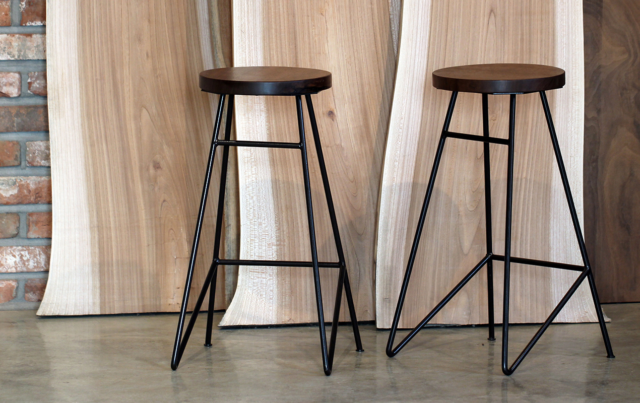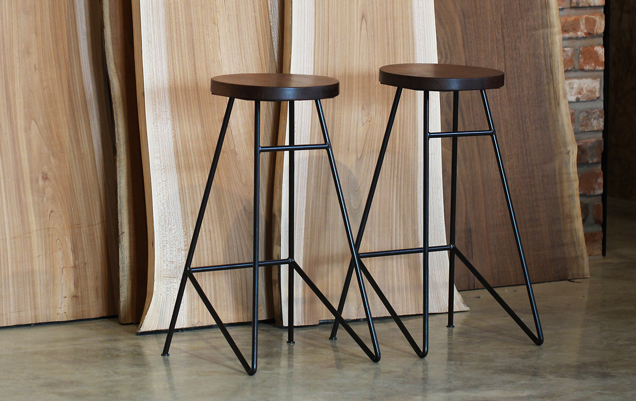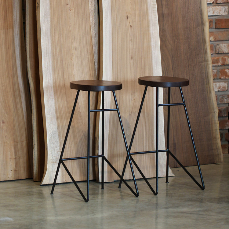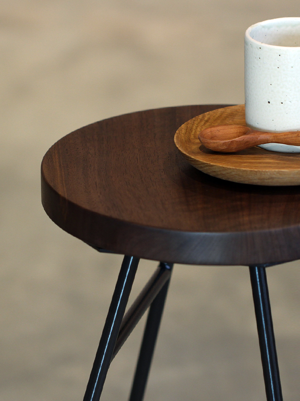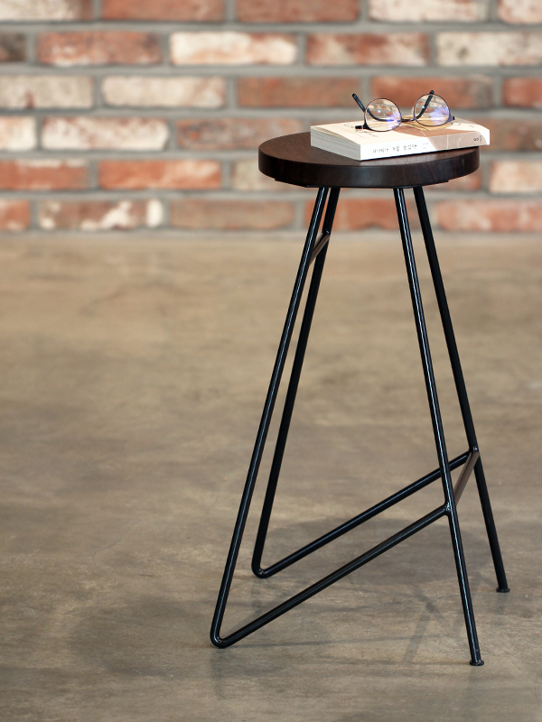 둥근 원목 상판에 대각선이 돋보이는 디자인의 철제다리로 작업한 스툴입니다.