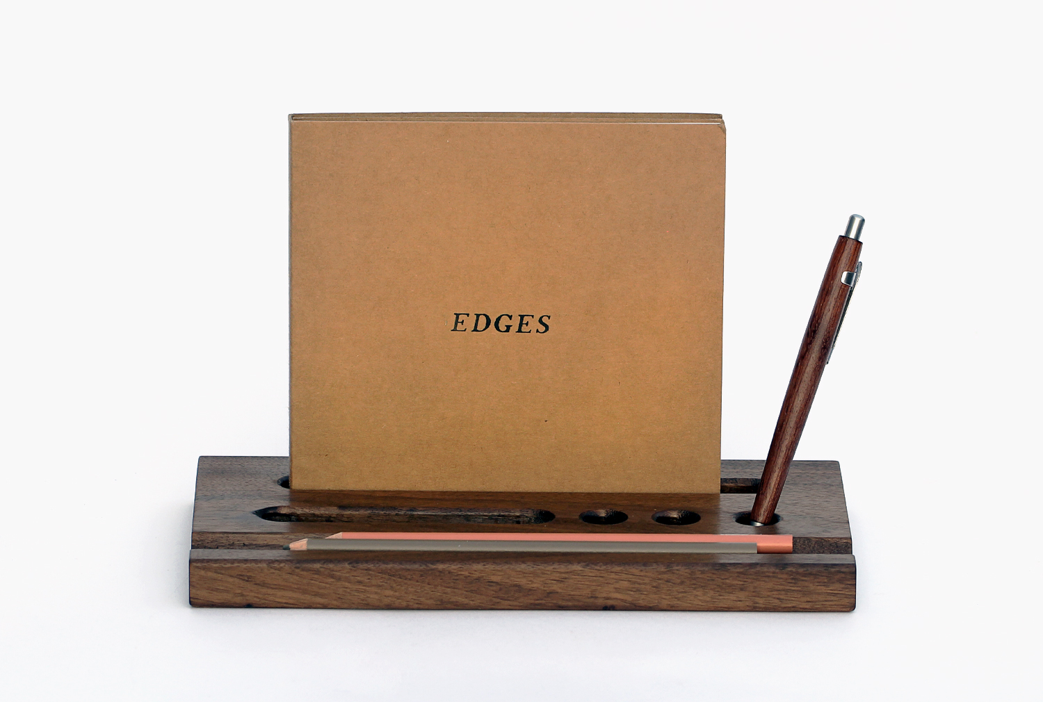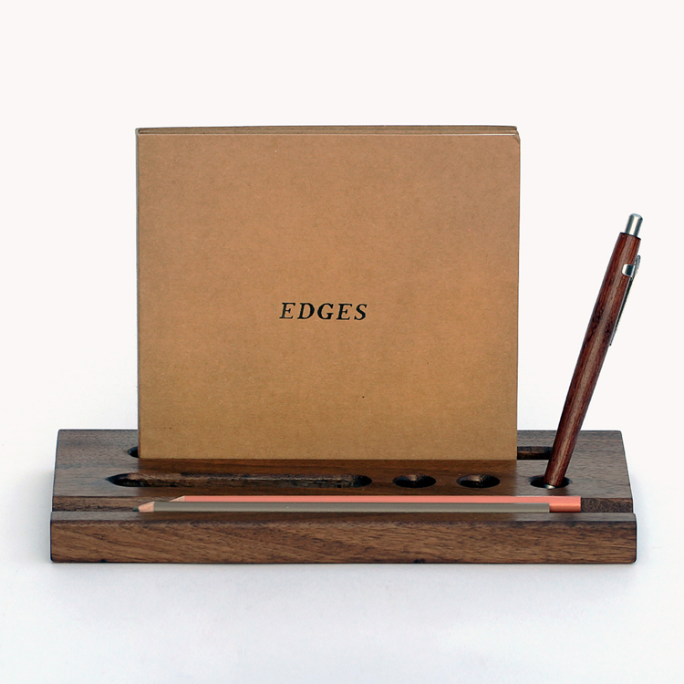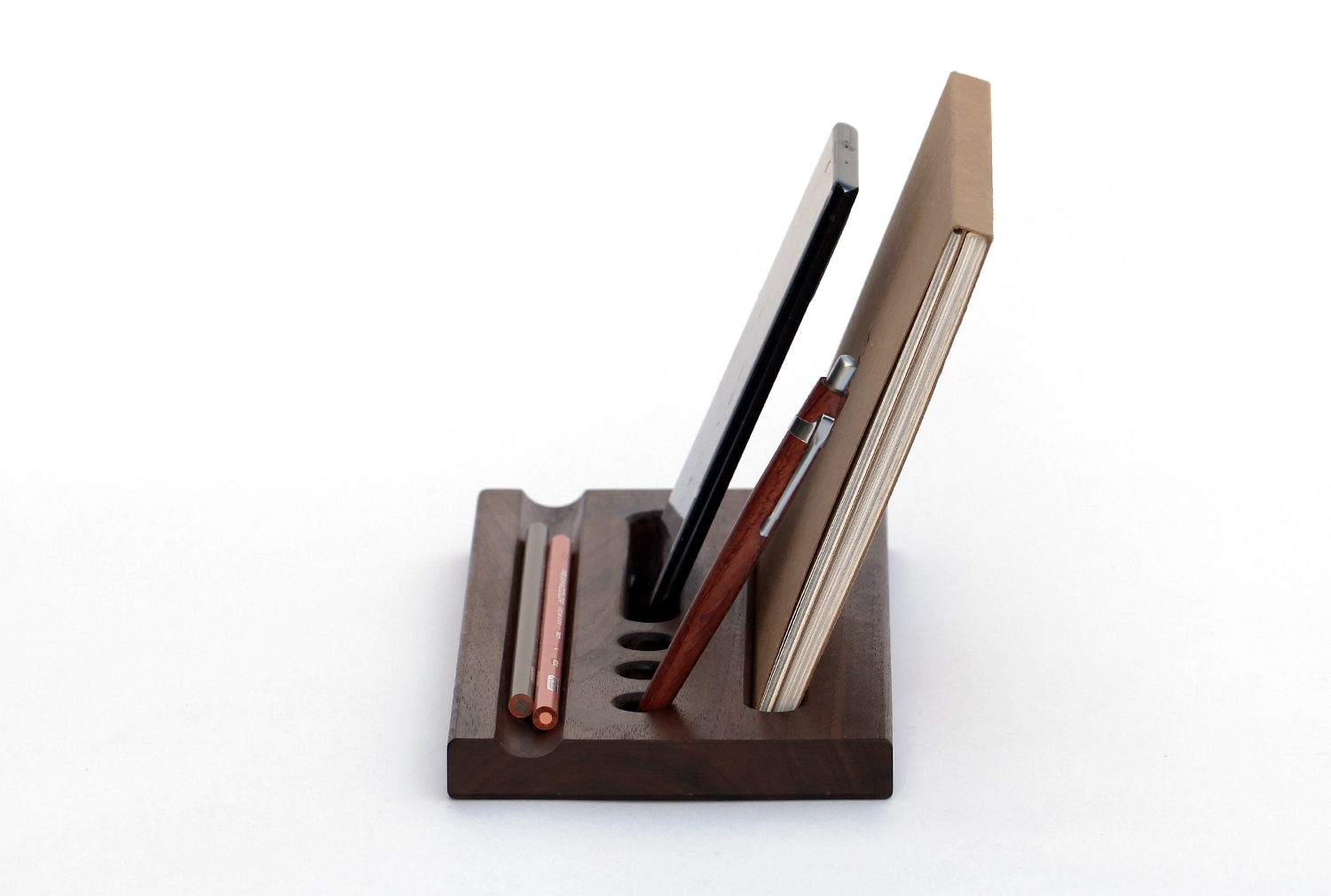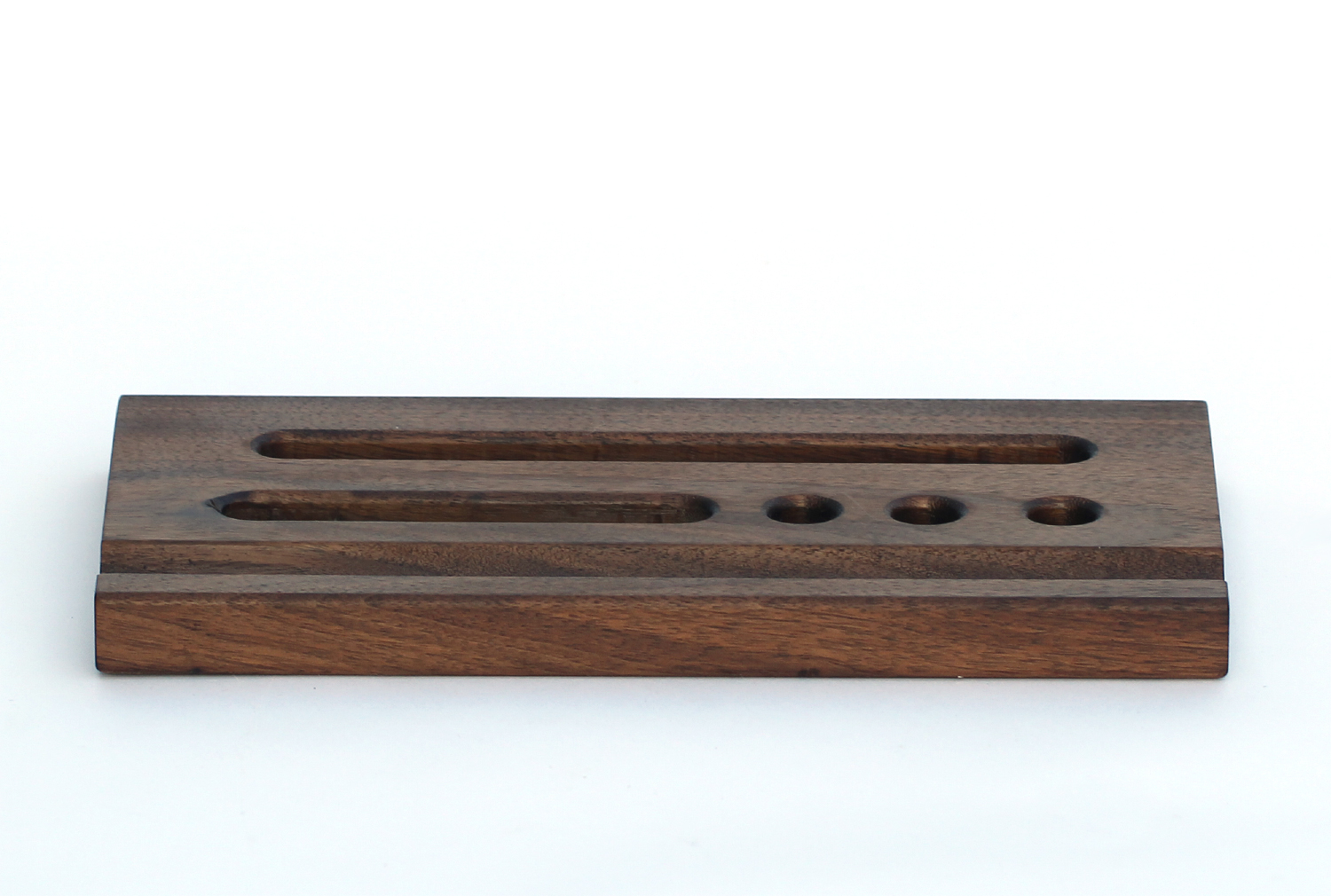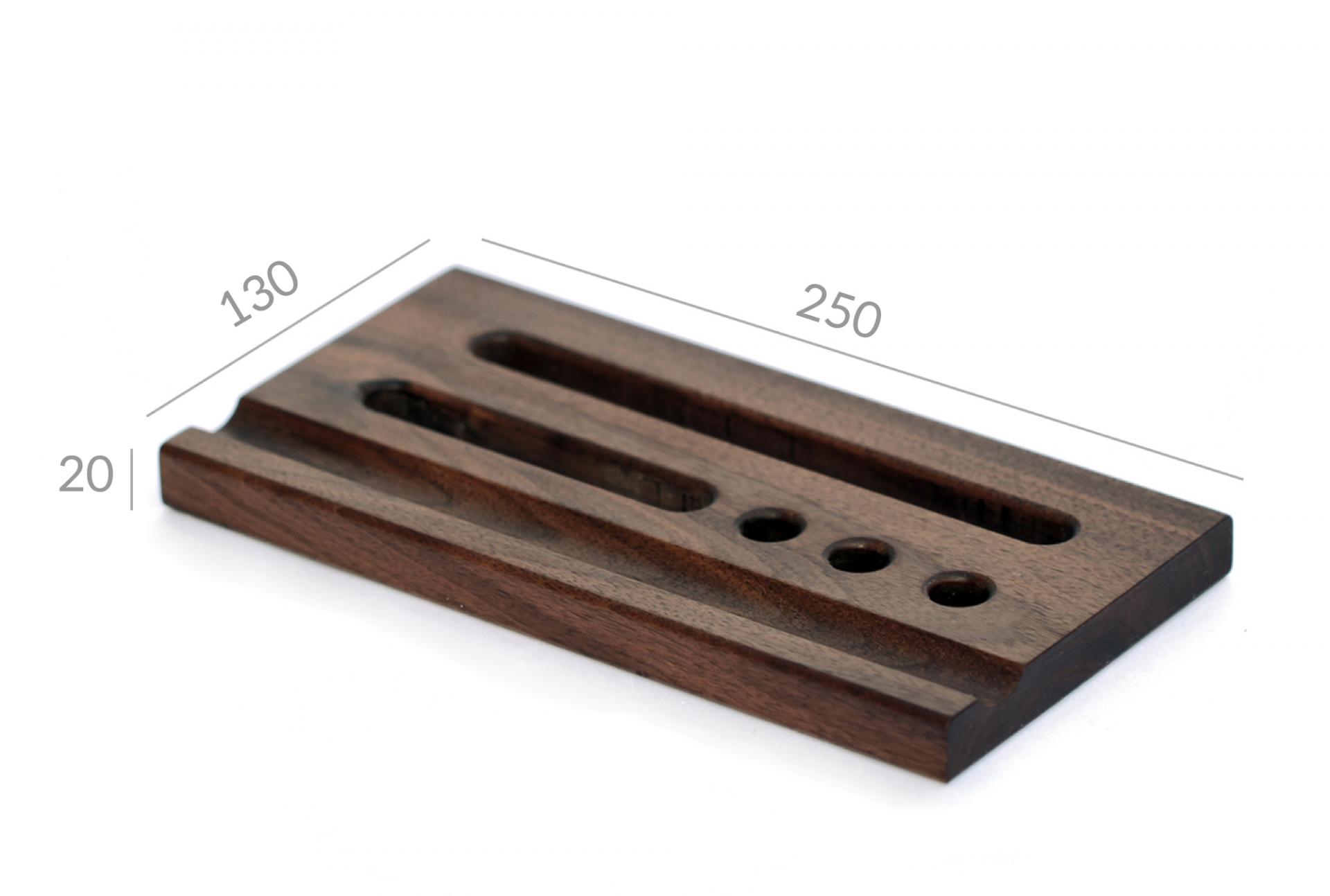 원목 바닥판에 반원형 홈과 펜이나 테블릿, 작은 책자 등을 꽂을 수 있는 구멍을 낸 펜트레이 입니다.