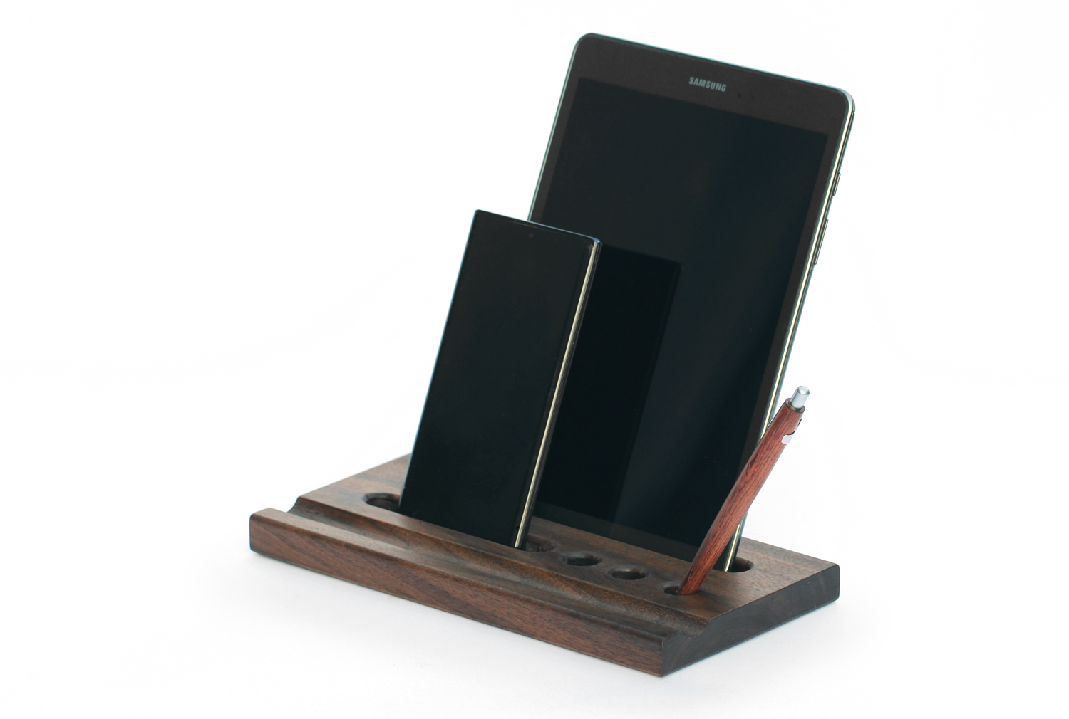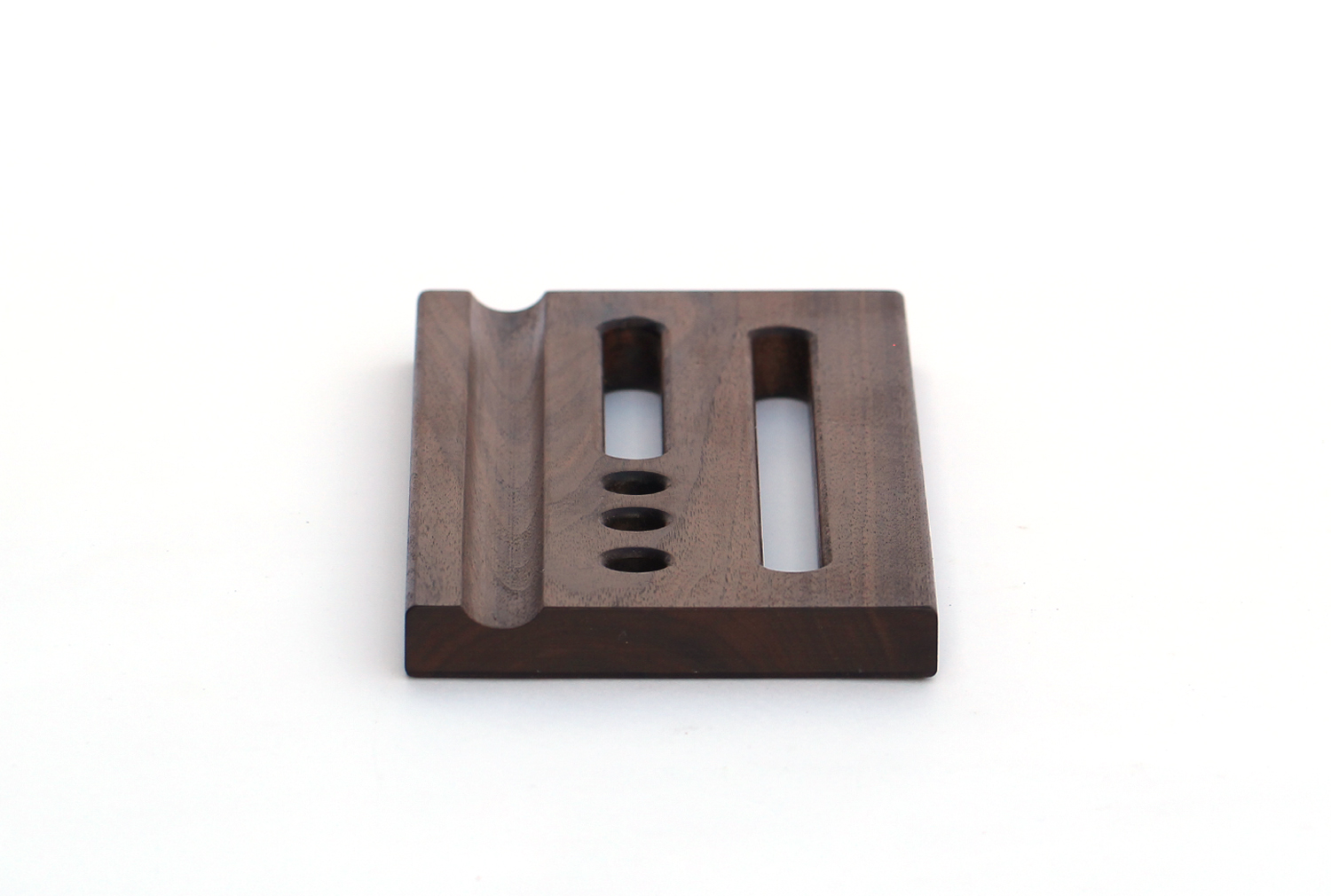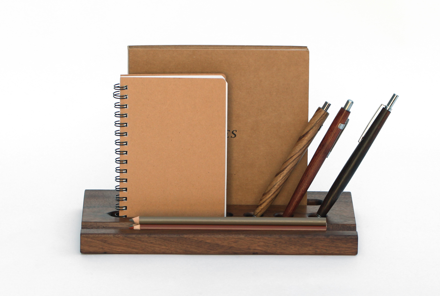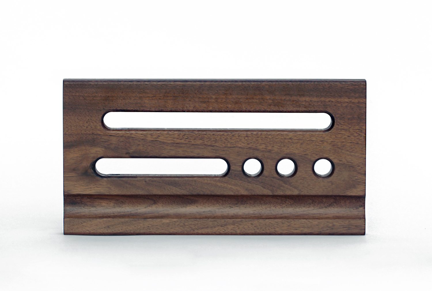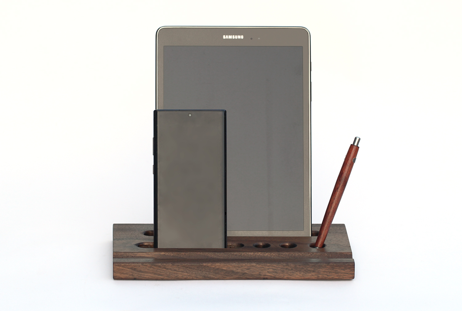 원목 바닥판에 반원형 홈과 펜이나 테블릿, 작은 책자 등을 꽂을 수 있는 구멍을 낸 펜트레이 입니다.